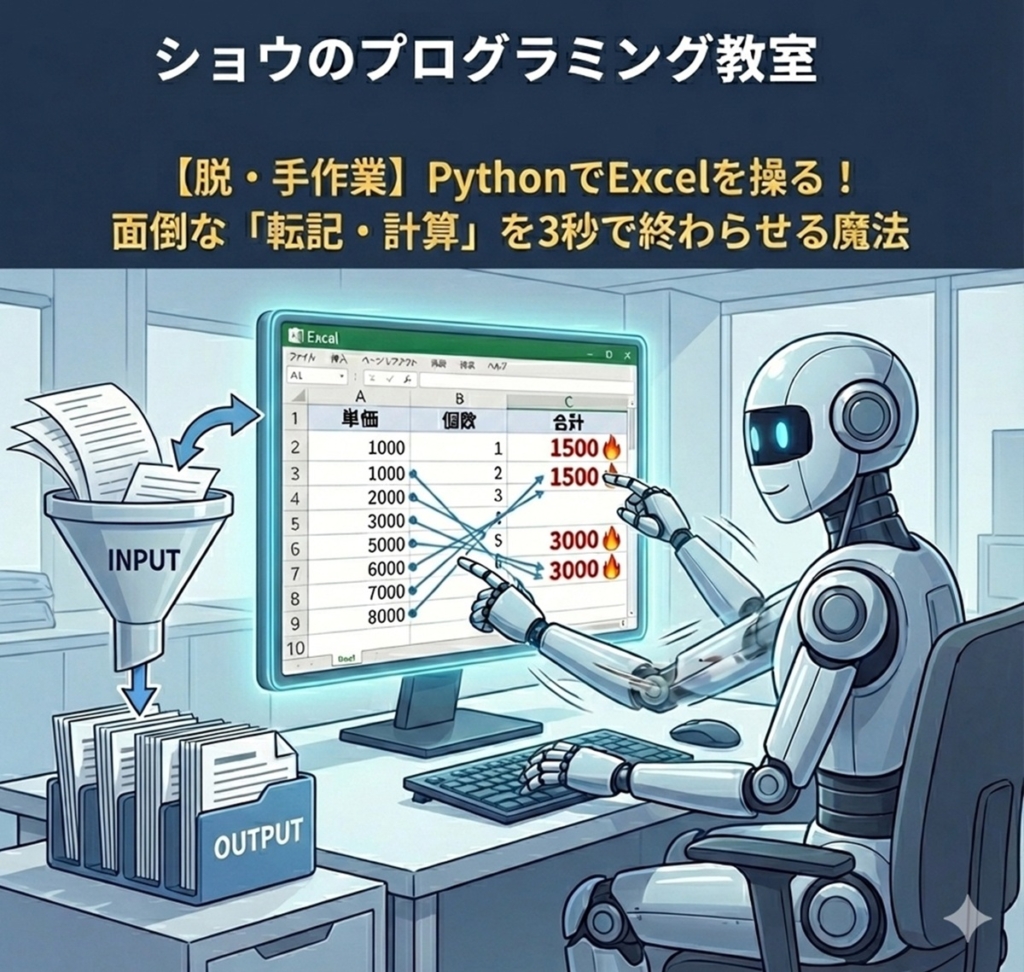 今回は、Pythonを使って**「Excel作業を全自動化する第一歩」**を踏み出してみましょう。これができるようになると、本業の残業が減るだけでなく、ココナラなどで「Excelマクロ・自動化案件」を受けられるようにもなりますよ!