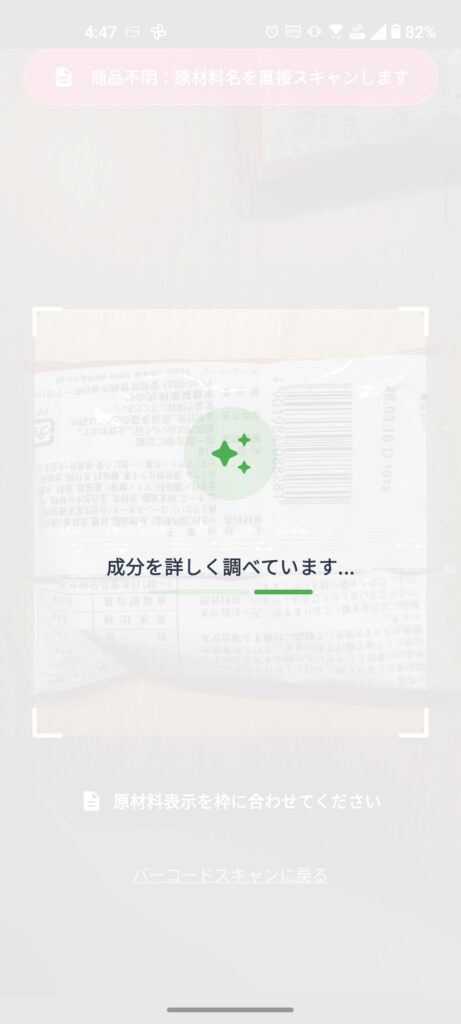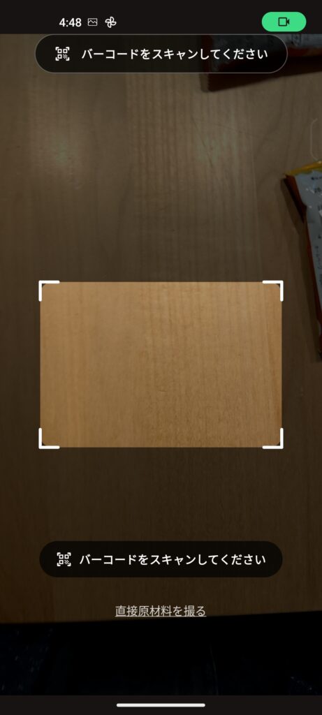 - 自動切り替えロジック: カメラが捉えた映像をリアルタイムで解析し、バーコードを認識すればバーコードリーダーモードに、**文字領域(原材料名)**を認識すればOCRモードに、アプリが自動で切り替わります。