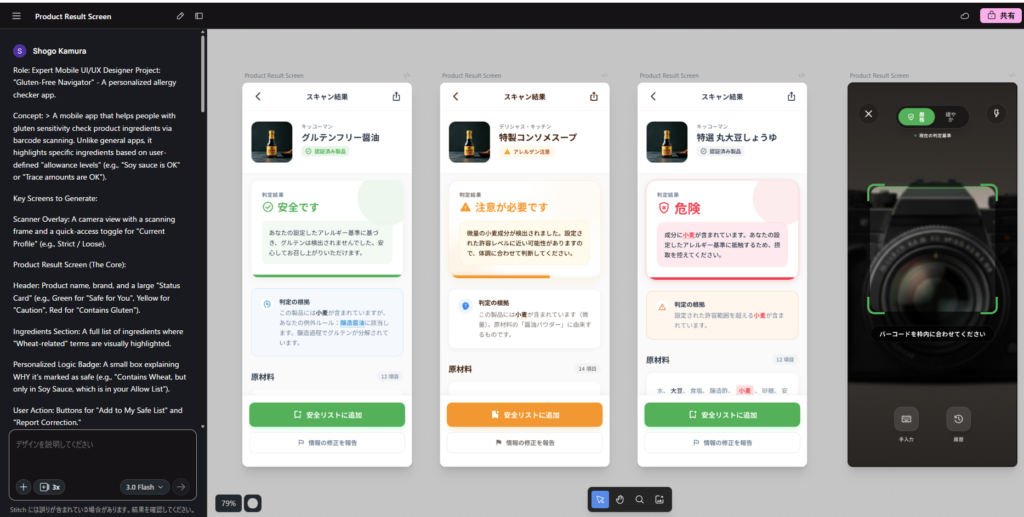 AIがいかに高度な判定をしても、それがユーザーに伝わらなければ意味がありません。 「情報の引き算」を徹底し、買い物という日常の動作に溶け込むデザイン、そしてGoogle Stitchで磨き上げた直感的な操作性とアニメーションによるスマートな自動切り替えが、Glu-Suppoの使い心地に繋がっていると信じています。